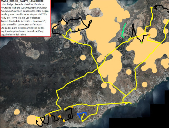 Ese tramo del rally, tal y como acredita el seguimiento de más de 50 ejemplares marcados con emisores, supone “una de las zonas más importantes para la especie en Lanzarote”. En su informe, entregado al Cabildo, los investigadores del CSIC superponen el trazado del rally con un mapa de localizaciones contrastadas de hubaras, que evidencia que el recorrido de la competición “está dentro del hábitat” y “afecta claramente a una de las áreas más utilizadas por la especie” en la Isla.