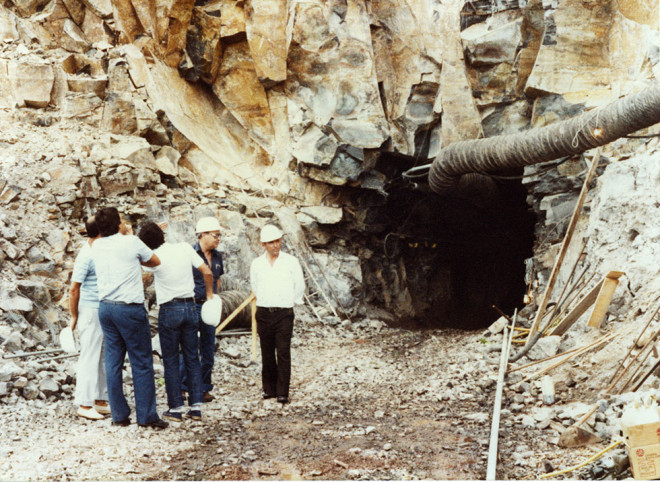 Foto de la construcción de una galería en el Risco de Famara en 1982, con varios técnicos y políticos del Cabildo de Lanzarote. La explotación de las aguas subterráneas fue otra reclamación habitual de la prensa histórica de ambas islas. Foto cedida por Antonio Lorenzo.