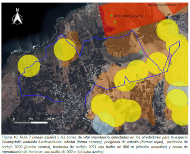 Decía ese informe, respecto a la hubara canaria, y algunas rutas coinciden en gran parte con el recorrido de este año, que se “solapan en algún punto con el hábitat de la especie” y que “afectaría igualmente a la zona de cortejo de machos y zona de reproducción de hembras prácticamente a lo largo de todo su recorrido”.