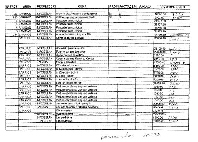 Cuadro de la contabilidad de Infogelanz, empresa que facturó más de un millón al Ayuntamiento. Como se puede ver, en la columna de observaciones, a la derecha, se anotan cantidades a boli en cada una de las obras, y debajo se subraya: Descuentos, 10.000.