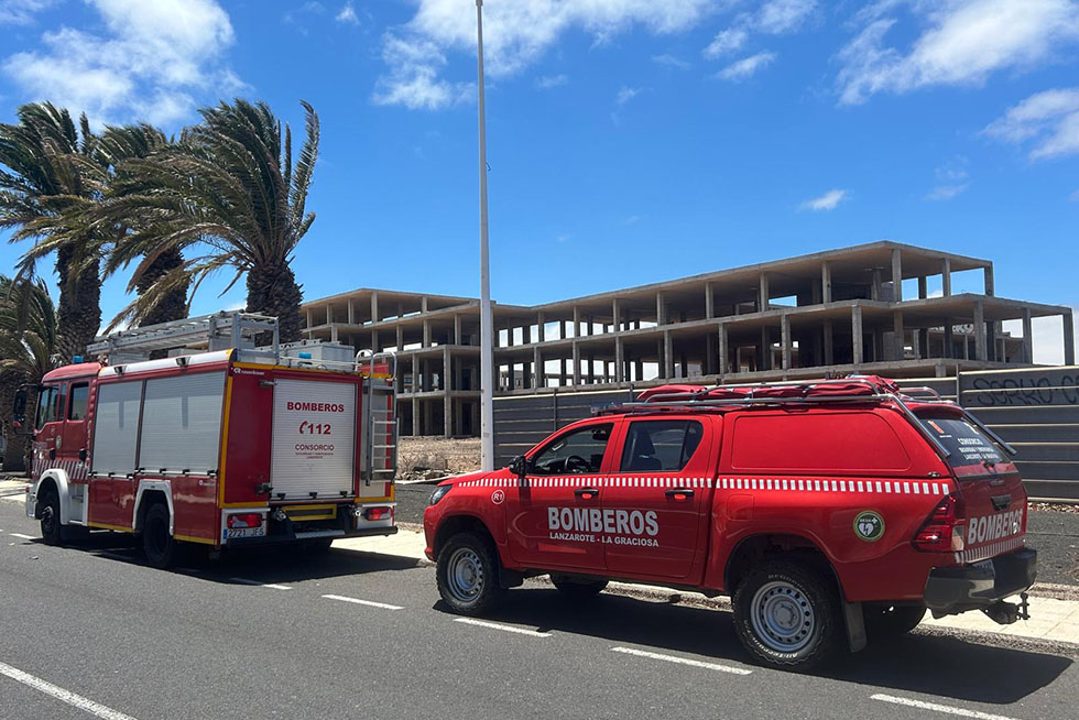 Los bomberos del Consorcio de Seguridad y Emergencias intervinieron junto al Servicio de Urgencias Canario (SUC) a la atención de un hombre accidentado, en estado crítico, en el ‘esqueleto’ de un hotel ilegal en Costa.