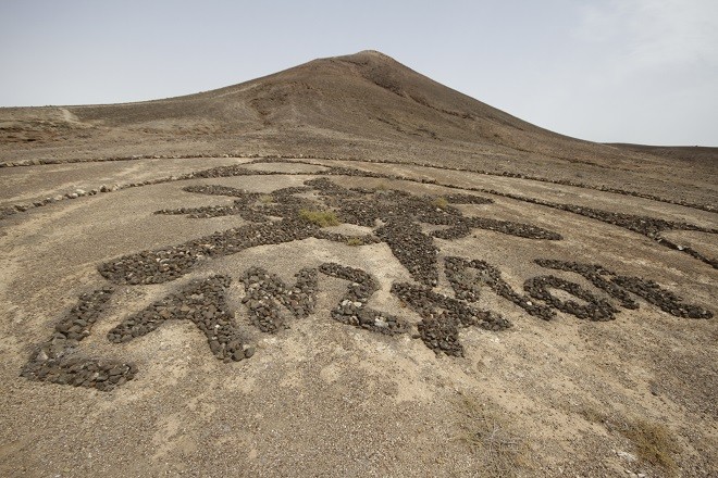 Volcán de Tinaguache. En las cercanías de Costa Teguise, a alguien con mucho tiempo libre y nada más, se le ha ocurrido que es buena idea hacer el logotipo de la Reserva de la Biosfera encerrado en un triángulo y a su vez en un círculo. Es una construcción contradictoria en sí misma y es de tal magnitud que se aprecia perfectamente en Google earth.