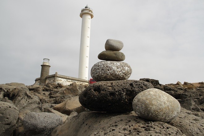 Faro de Pechiguera. La acumulación de piedras es común en el litoral. En casi todas las playas de la Isla se pueden ver.