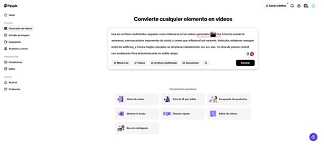 Abre Pippit, regístrate y ve a la sección "Generador de video". Haz clic en "Agregar multimedia" para subir tu foto. Puedes hacerlo desde tu dispositivo, teléfono, Dropbox o pegando un enlace. Si no tienes una lista, usa los assets disponibles. Ingresa una instrucción descriptiva que coincida con tu idea. Una vez lista, haz clic en "Generar".