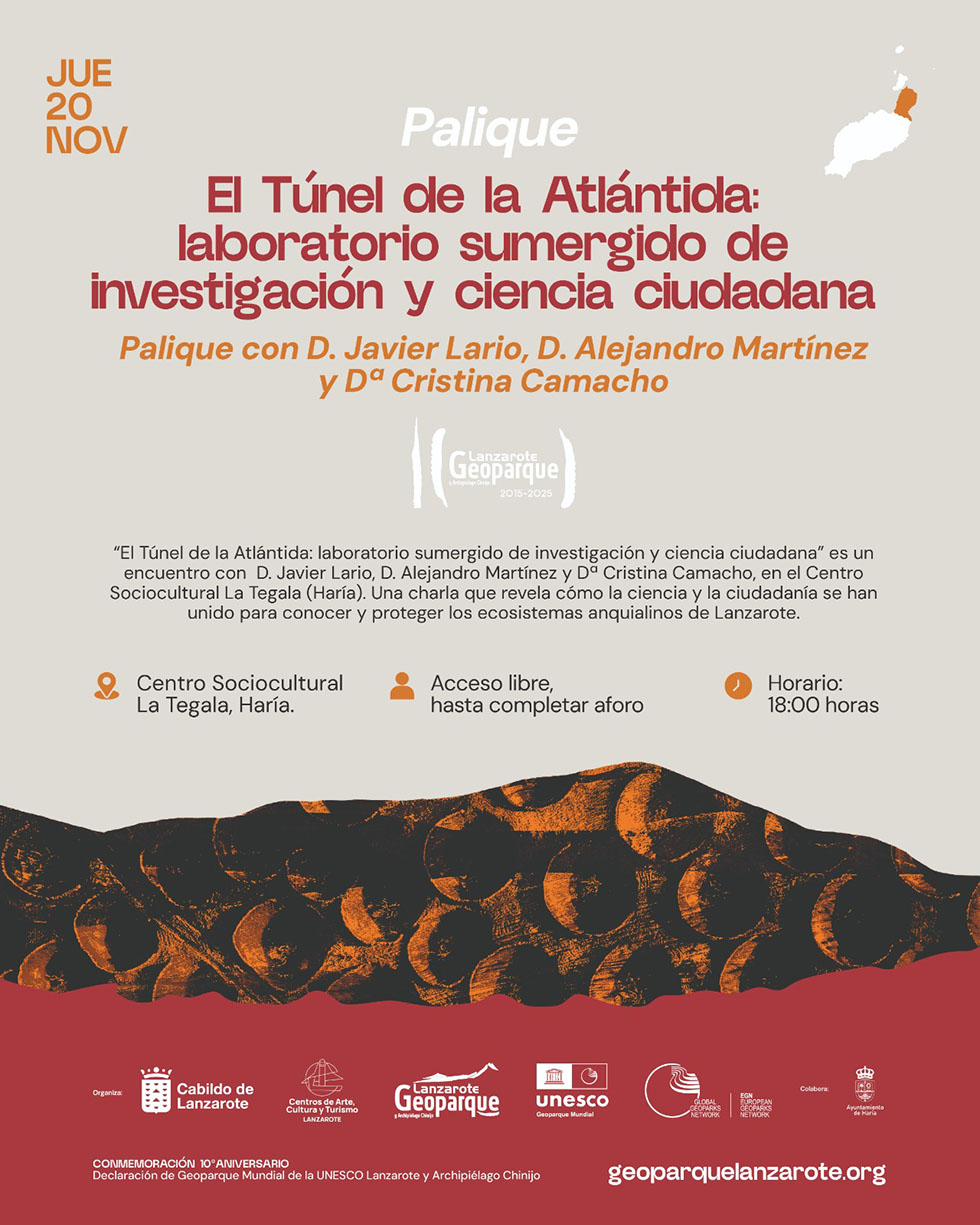 Con motivo del décimo aniversario del Geoparque Mundial UNESCO Lanzarote y Archipiélago Chinijo, el Cabildo de Lanzarote organiza una nueva actividad dentro de su amplio programa de actos. Se trata de la conferencia sobre ciencia e investigación titulada El Túnel de la Atlántida: laboratorio sumergido de investigación y ciencia ciudadana, impartida por los profesionales Javier Lario, Alejandro Martínez y Cristina Camacho.