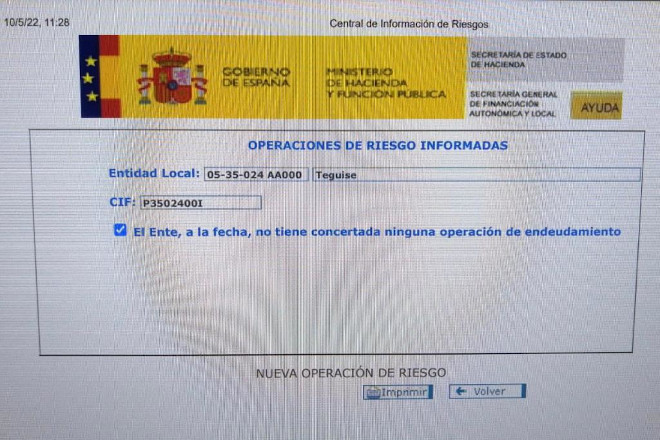 El Ministerio de Hacienda y Función Pública del Estado ratifica la deuda cero de Teguise con entidades bancarias después de que el Ayuntamiento hiciera frente a los 22 millones de euros de obligaciones financieras que tenía el Consistorio hasta el año 2011.