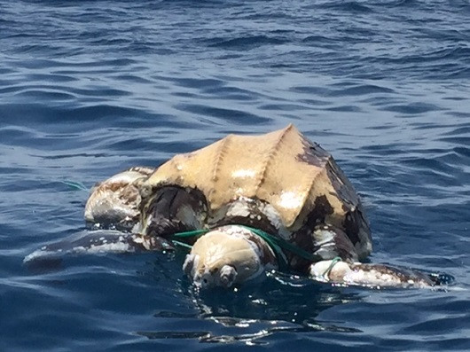 El ejemplar, perteneciente a la familia Dermochelys, se encontraba muerto y presentaba sus aletas y cuello enredados en un cabo, lo que apunta a una posible asfixia.