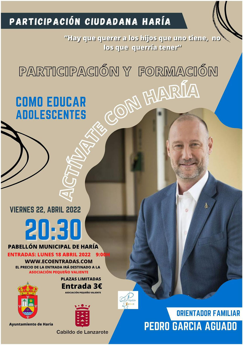 El Ayuntamiento de Haría, a través del Área de Participación Ciudadana, que coordina Alejandro Hernández, en colaboración con el Cabildo de Lanzarote, organizará el próximo 22 de abril la ponencia ‘Cómo educar adolescentes’. A esta formación, que correrá a cargo del reconocido ex deportista español y educador familiar, Pedro García Aguado, se sumará la del psicólogo Rafael Santandreu, ambas enmarcadas en el proyecto ‘Actívate Haría’.