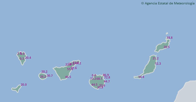 De esta manera, en Teror (Gran Canaria) se han recogido más de 91 litros de agua por metro cuadrado, y en Güimar (Tenerife) casi 98 litros por metro cuadrado.