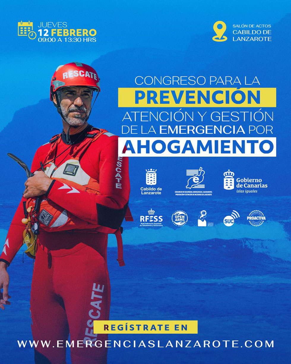 El Cabildo de Lanzarote acogerá el próximo jueves, 12 de febrero, de 9.00 a 13.30 horas, en el Salón de actos, el 'Congreso sobre Prevención, Atención y Gestión de Emergencias por Ahogamientos en el Medio Acuático en Canarias', una iniciativa de interés público promovida por el Consorcio de Seguridad y Emergencias orientada a la reducción de la siniestralidad por ahogamientos y a la mejora de la coordinación y capacidad de respuesta de los servicios implicados.