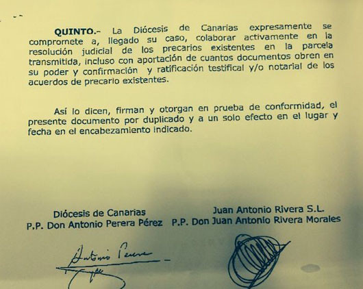 “El incumplimiento de estas condiciones a las que se obliga la mercantil Juan Antonio Rivera dará lugar a que la Diócesis de Canarias pueda exigir el cumplimiento de las mismas a dicha mercantil”, señala otra cláusula. La última cláusula dice que la Diócesis se compromete a colaborar activamente en la resolución judicial de los precarios existentes en la parcela con documentos o ratificación testifical o notarial de los acuerdos existentes.