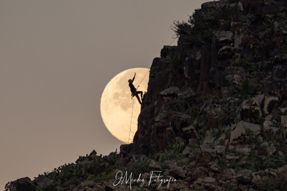 “En aquellos lugares con posibilidades para la imagen siempre aparecían la bruma, la calima o algunas nubes en el horizonte que dificultaban la fotografía”, continúa. “Tras diferentes intentos a lo largo de varios meses recorriendo la zona norte de la Isla, al final dimos con Guinate. Mi buen amigo Jesús hizo gala de una paciencia infinita montando y desmontando el equipo en incontables ocasiones y esperando el momento idóneo durante decenas de sesiones. Pero al final, el trabajo dio sus resultados: fueron varias jornadas de madrugones, planificación y espera hasta encontrar el momento perfecto en que el escalador, la luna, las nubes y demás elementos encajaran de forma correcta”.