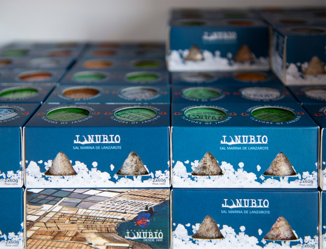 Salinas de Janubio presenta su apreciado producto en distintos formatos: desde paquetes de un kilo o medio kilo a los molinillos de sal natural o con especias, como perejil o cayena. También vende sus productos en prácticos envases para llevar en packs de 4, 2 y 1. Sin olvidar en su variado muestrario otro apreciado artículo: las sales de baño.