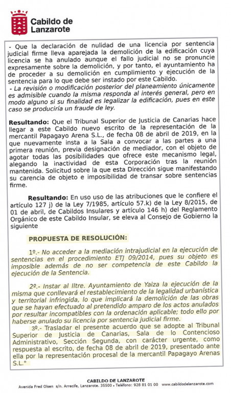 Para la Asesoría Jurídica del Cabildo, “no procede” esa mediación en la ejecución de la sentencia del Papagayo Arena, “pues su objeto es imposible”.