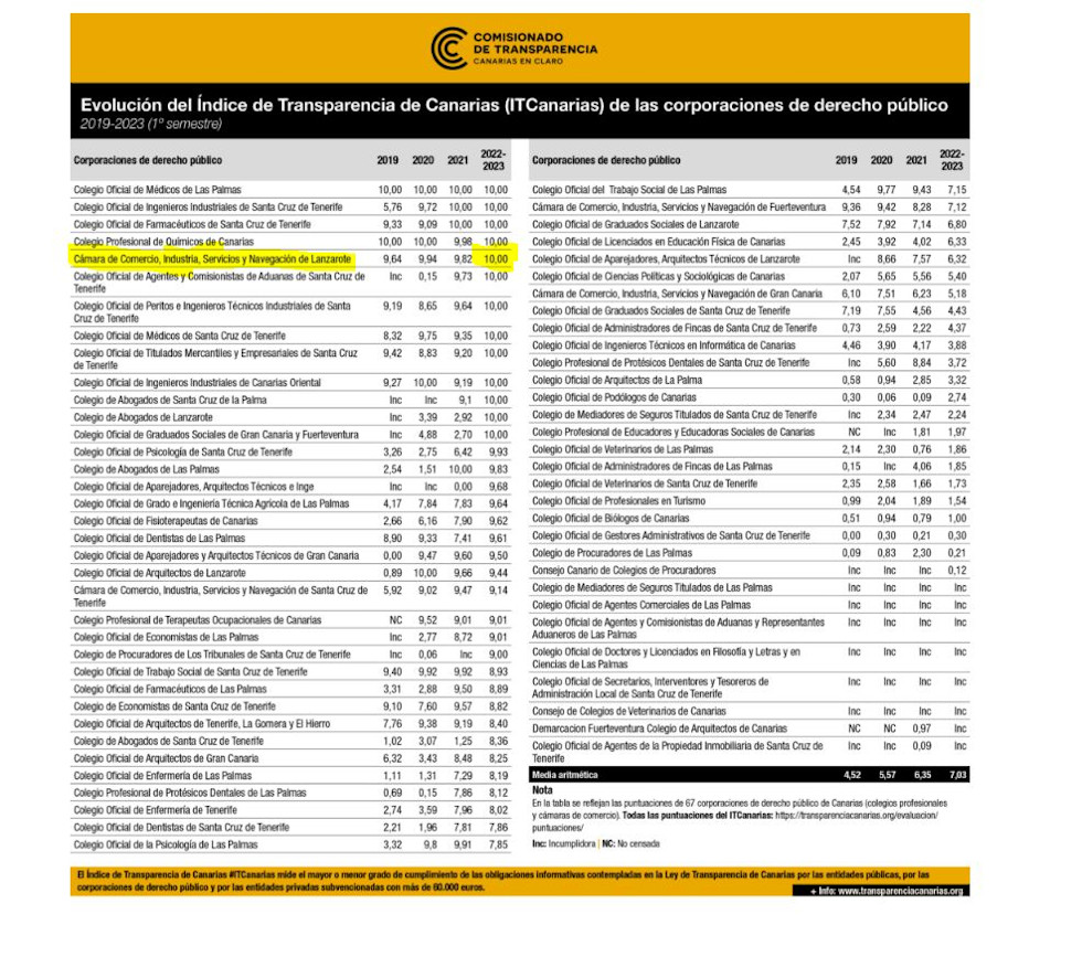 La Cámara de Comercio de Lanzarote y La Graciosa obtiene un 10 de puntuación en el índice de Transparencia de Canarias de las corporaciones de derecho público.