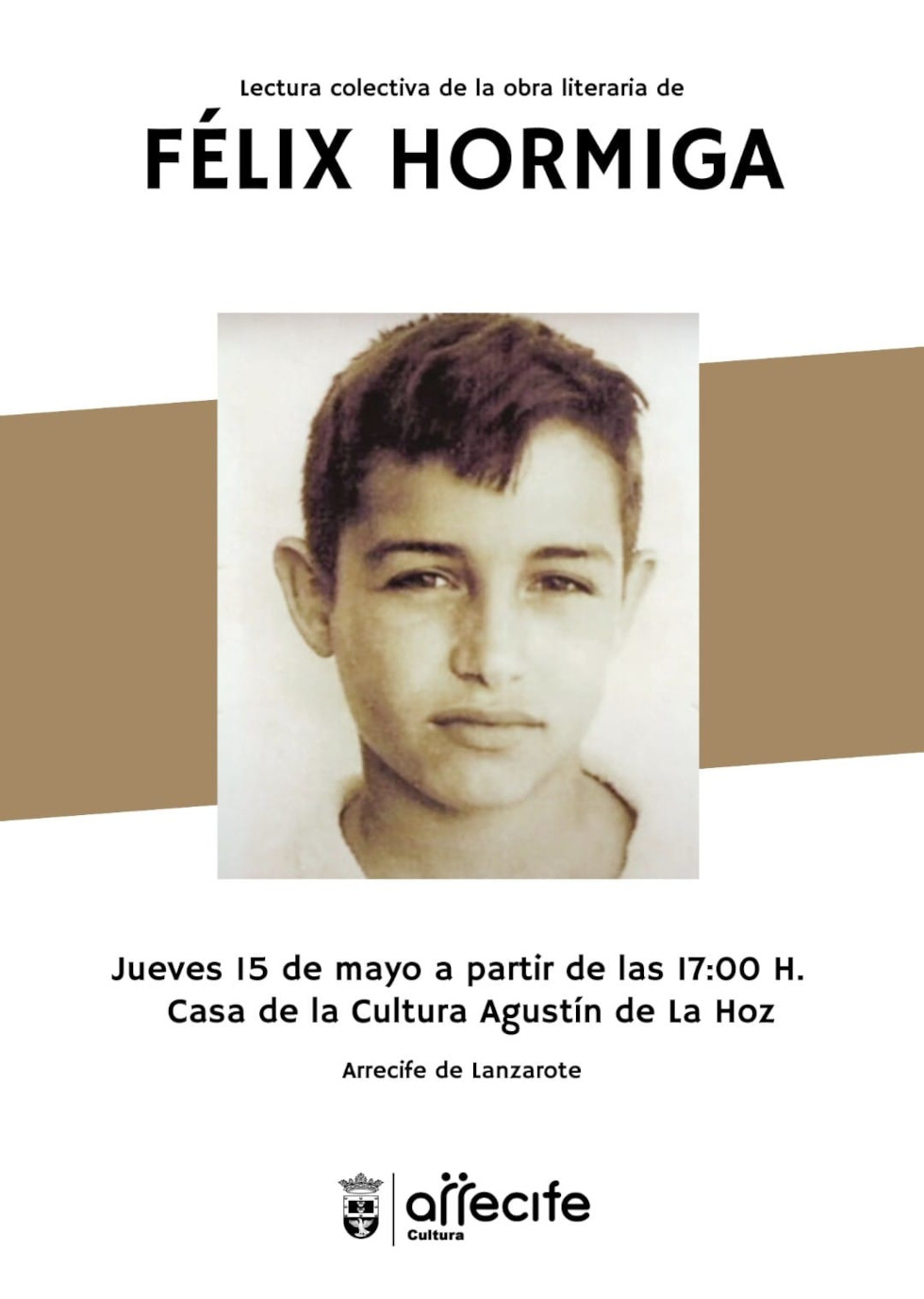 La Casa de la Cultura Agustín de la Hoz acoge en la tarde de este jueves 15 de mayo una lectura colectiva de la obra de Félix Hormiga organizada por Cultura Arrecife, que dirige la concejala Abigail González, quien destaca "el honor que supone rendir homenaje a la figura de todo un referente imprescindible de las letras lanzaroteñas, en la que se resaltará la profundidad y sensibilidad de su escritura y su reflexión sobre la realidad canaria y el devenir histórico de nuestro Archipiélago".