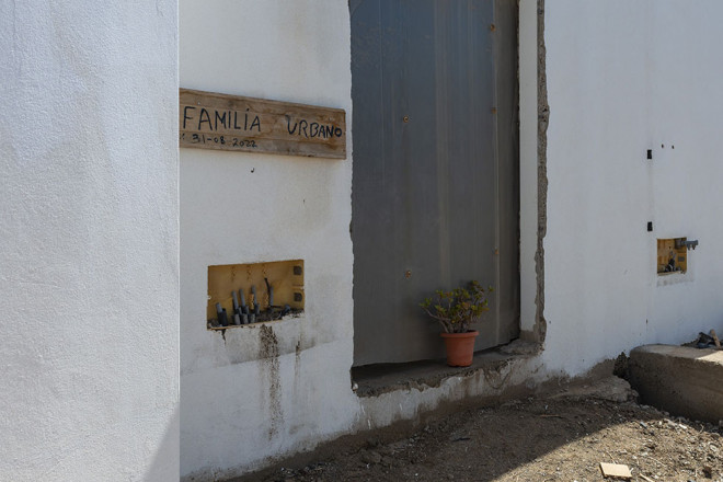 La hilera, con casas a ambos lados, es un camino por el que pasan los coches sin problema. Los cascotes y escombros están apilados en los márgenes. En algunas casas alguien ha escrito la leyenda “adjudicada”. En otras hay carteles de madera: “Familia Urbano, 31-08-2022” o “Familia Chamorro Quiroz. Empadronado 28-08-2022”.