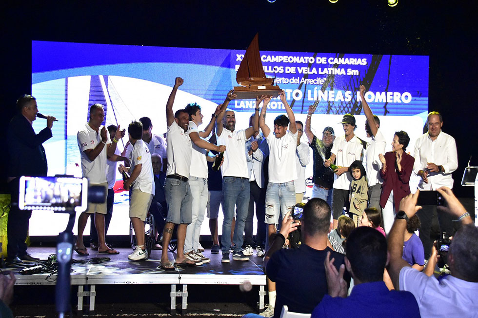 El Graciplus de Nete Armas recibió el trofeo como tercer clasificado del Campeonato de Canarias de Barquillos de Vela Latina de 5 Metros “Ciudad y Puerto del Arrecife”. El Tritón de Kevin Cabrera acabó la competición en una meritoria segunda posición, estando a punto de revalidar el título de campeón logrado en la pasada edición. Y el gran aplauso se lo llevaron los componentes del Romerito como nuevos campeones de Canarias.
