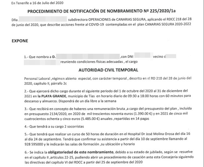 Indica la carta que el nombramiento se realiza en virtud de Real Decreto 218 de 28 de junio de 2020 (este Real Decreto si bien existe no dispone ese nombramiento) con ocasión de la declaración de pandemia por COVID-19 para ejercer dicho cargo con una remuneración y horario pre-establecido en una playa cerca de su lugar de residencia y “recibirá en concepto de haberes una remuneración bruta, a cargo del presupuesto del plan en 2020 de 1.390 euros y en 2021 de 5.485 euros anuales, repartidas en 14 pagas”.