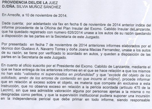 El presidente del Cabildo, Pedro San Ginés, envió ese y otro informe al Juzgado y añadió que no habían sido validados por la asesoría jurídica del Cabildo pero que el informe de Macías “excede el objeto de lo solicitado” y que tiene “errores” de contenido.