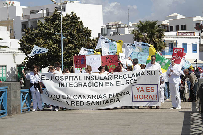 La plantilla del Hospital Insular, que depende del Cabildo de Lanzarote, con el respaldo de numerosos ciudadanos, se ha manifestado el sábado por la mañana para exigir la integración en el Servicio Canario de Salud del Gobierno de Canarias.