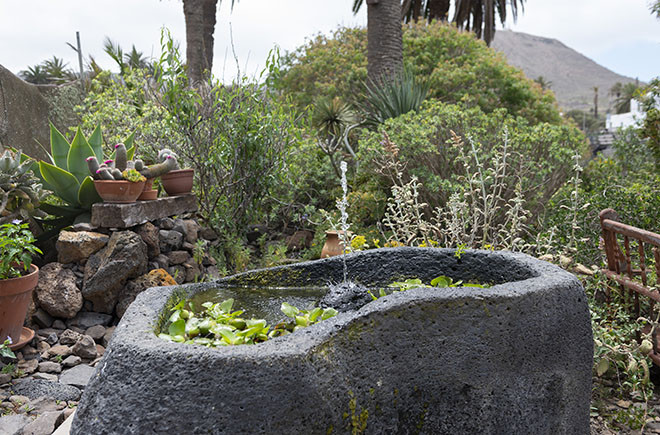 Riebold lanzó el proyecto de reforestación de Montaña Aganada con neblinómetros y construyó su casa aprovechando lo poco que quedaba de una antigua pescadería. Fue plantando el jardín poco a poco y en él se pueden ver árboles como la palmera canaria, el acebuche, el lentisco o el drago y flores como la aeonium lancerottense, dos especies autóctonas de la familia de los espárragos, la convolvulus lopezsocasi, representantes de la familia de asteriscus, la caralluma buchardii, especies de lavándula, limonium, el romero marino, la correguela o la aeonium balsamiferum, con su flor amarilla, considerada como un manjar por las cabras. “Un experto local me dijo que tengo más de estos en mi jardín que en el resto del mundo juntos”, asegura.