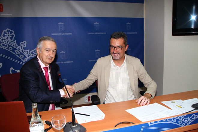 El consejero de Sanidad y Bienestar Social del Cabildo de Lanzarote, Marciano Acuña, y el director de la Fundación Canaria para el Control de las Enfermedades Tropicales, Basilio Valladares, firmaron un convenio de colaboración que permitirá a la Isla contar desde el próximo mes de septiembre con un protocolo de vigilancia frente a la posible entrada de mosquitos transmisores de enfermedades a través del aeropuerto y el puerto de Arrecife.
