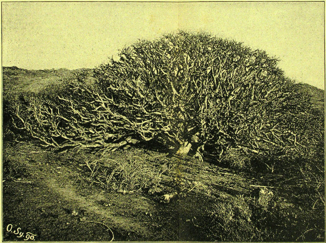 Tabaiba dulce de “cinco metros de ancho por dos metros de alto en un terreno arenoso rodeado de acumulaciones de escoria cerca de la costa este de Isla de Lobos”. Simony tomó esta fotografía el 15 de septiembre de 1890.
