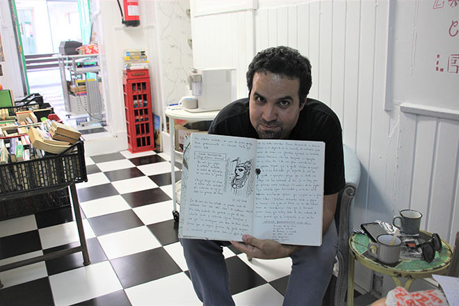 La aportación al mundo de las letras de Alexis de La Cruz es un poemario autoeditado en Barcelona en 2015, Eclipse de girasol, cuyos últimos ejemplares se han despedido estos días de su autor y han dejado La Madriguera, camino de mesillas de noche, estanterías y rincones de lectura. Aleddín Delacroix, alter ego del librero cuando estaciona el negocio y se dedica al placer, despliega una potente voz en verso y prosa poética, intimista, irónica y conectada con la actualidad.