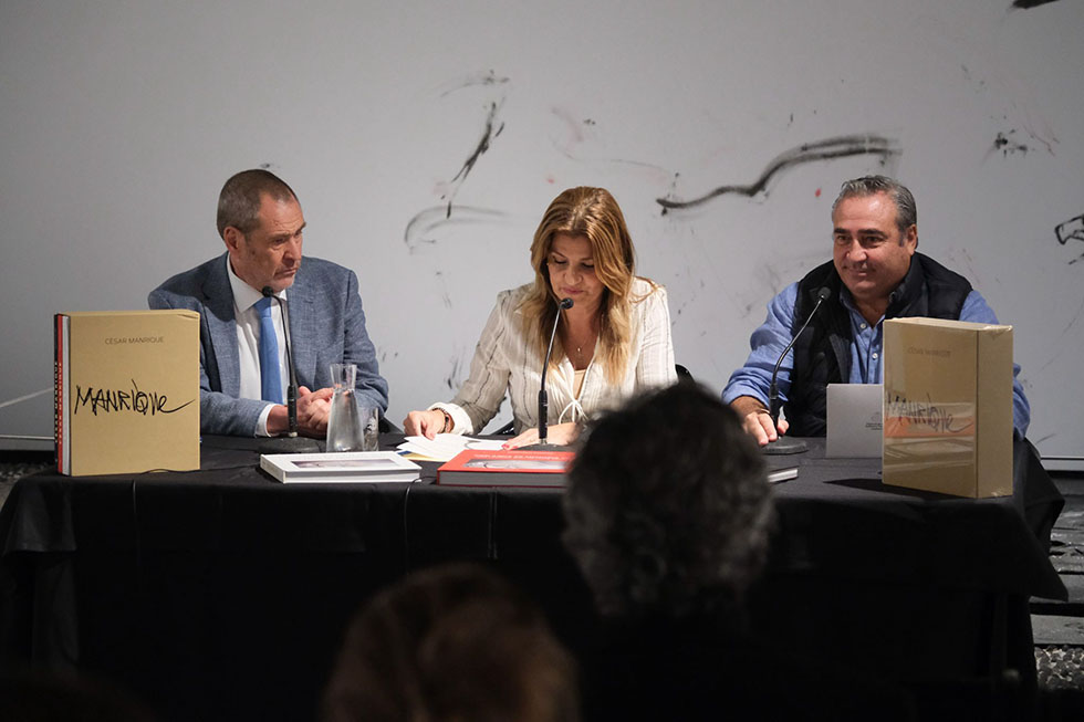 La vicepresidenta del Cabildo de Lanzarote, María Jesús Tovar, el consejero de los Centros de Arte, Cultura y Turismo, Ángel Vázquez, y el catedrático de Historia del Arte de la Universidad de La Laguna y profesor, investigador y consultor académico de la Katholieke Universiteit de Lovaina, Francisco Galante, han presentado esta mañana 'César Manrique. Cien años de Memoria viva', "un minucioso trabajo de investigación sobre una de las grandes figuras de la historia contemporánea de la isla". En el acto estuvo presente, asimismo, el consejero de Cultura de la Primera Institución insular, Jesús Machín, así como amigos y familiares del autor.