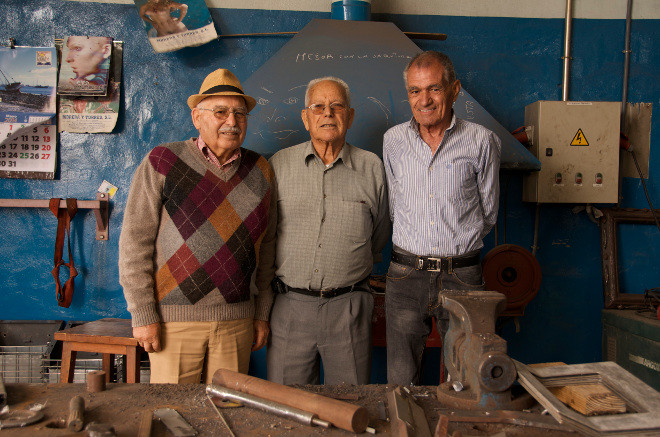 Luis Morales en el centro, junto a dos de sus colaboradores en el Cabildo: Santiago Hernández, a la derecha, y Federico Padrón Morales, a la izquierda. Imagen del rodaje de ‘Maestro de obra’ (Miguel G. Morales, 2014).