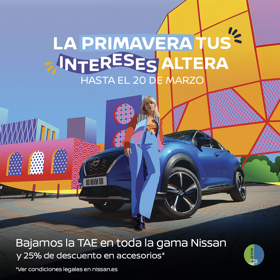 Hasta el 20 de marzo los clientes que compren un vehículo nuevo Nissan podrán beneficiarse de la campaña de Nissan “La primavera, tus intereses altera” con una bajada al 4.9% T.A.E, hasta 1000 euros de descuento en toda la gama Nissan (vehículos en stock), tres años de mantenimiento oficial Nissan de regalo (sujeto a financiación) y un descuento del 25% en accesorios.