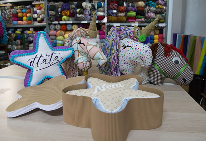 Otra división de la mercería es la decorativa. Moreyba ha trasladado a Encajes su anterior negocio de textiles personalizados, desde cojines a caballitos de juguete, camisetas o bolsas, que siguen teniendo muy buena acogida entre la clientela.