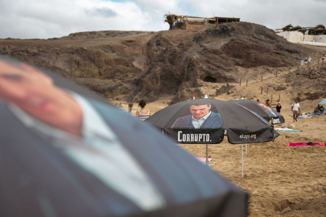 En las citadas sombrillas, al igual que en la pegativa, se podía ver la imagen del presidente Sánchez junto al mensaje “corrupto”.
