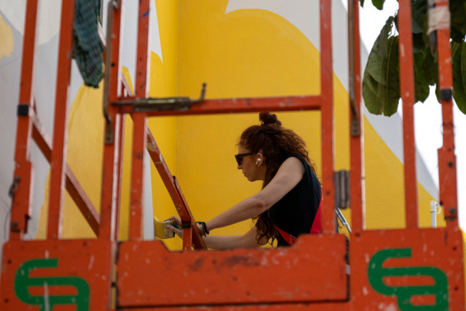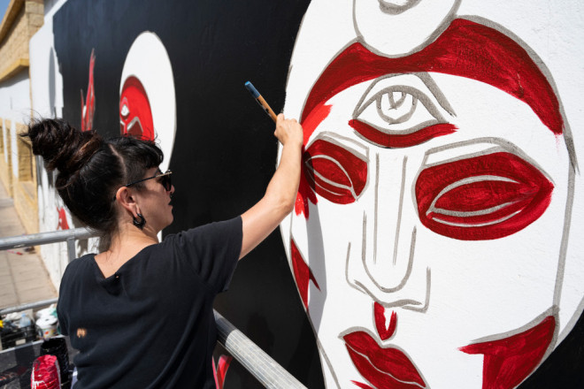 Emma López Leyton ha intervenido en la entrada del servicio Hortofrutícola de Altavista (calle Ico, número 9). Su obra representa a unas diosas creadoras de naturaleza, que llenan el muro de especies endémicas de Lanzarote “reivindicando más espacios verdes y recreativos en todos los barrios de Arrecife”.