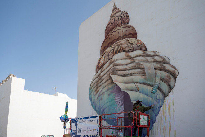El artista Feo Flip, uno de los autores de arte urbano más reconocidos en Canarias, España y buena parte de Europa, ha representado un bucio que conecta el pasado de la cultura aborigen con un presente taladrado por un turismo que monopoliza todos los aspectos de nuestra vida.