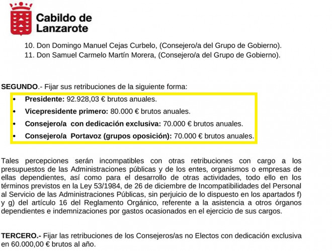 Además, el vicepresidente primero del Cabildo, Jacobo Medina (PP), cobraría 80.000 euros brutos anuales y cada consejero con dedicación exclusiva 70.000 euros brutos anuales, que pueden ser más por “la asistencia a órganos dependientes e indemnizaciones por gastos ocasionados en el ejercicio de sus cargos”. También los portavoces de los grupos de la oposición liberados por el Cabildo percibirían 70.000 euros brutos anuales.