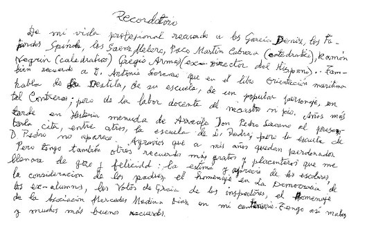 Pasa el mediodía de un día de verano, se acaba de ir el peluquero y hay cita con el maestro para hacerle una fotografía para este reportaje. La entrevista se ha hecho unos días antes. Don Pedro está sentado en una silla leyendo 'Historia menuda de Arrecife', de Antonio Lorenzo. Entre el día de la entrevista y el día de la foto ha escrito, de su puño y letra, un texto que titula “recordatorio”, en el que recuerda a algunos de los que fueron sus alumnos, da las gracias a algunas personas y plasma algún agravio histórico que perdona de forma inmediata. Después de posar se ofrece para levantarse y retratarse junto a una foto que refleja cómo era la casa en la que nació, que ocupaba el mismo espacio donde aún sigue viviendo, ahora en otro edificio y en la quinta planta.