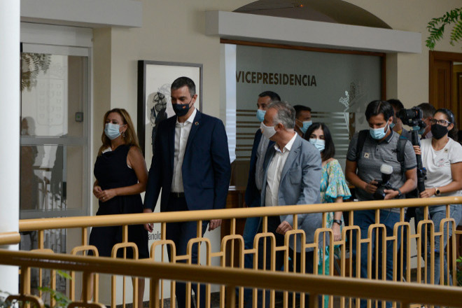 Sánchez llegaba en una comitiva de tres vehículos Volvo de alquiler, en traje, sin corbata y con una mascarilla negra con la bandera de España. Ha saludado con el codo a la comitiva que le esperaba a la entrada de la puerta principal: el presidente del Gobierno de Canarias, Ángel Víctor Torres, la presidenta del Cabildo de Lanzarote, Loli Corujo, el delegado del Gobierno en Canarias, Anselmo Pestana, la ministra de Política Territorial y Función Pública, Carolina Darias y Francisco Hernández Spínola, secretario de Estado de Función Pública.