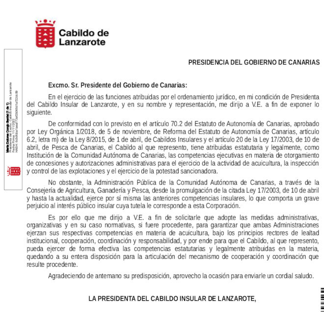 Corujo apunta que se trata de “competencias insulares” y añade que el hecho de que el Gobierno de Canarias las ejerza “comporta un grave perjuicio al interés público” de Lanzarote. En aquella comunicación, Corujo solicita a Torres que “adopte las medidas administrativas, organizativas y en su caso normativas” para “garantizar” que el Cabildo “pueda ejercer de forma efectiva las competencias” que le otorga el Estatuto sobre la acuicultura. La respuesta llegó en forma de informe de los servicios jurídicos del Gobierno rechazando la petición de Corujo.
