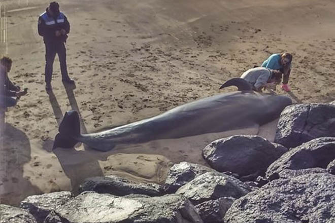 Agentes de la Policía Local de Tías fueron alertados el pasado fin de semana sobre la presencia de un cetáceo marino en la zona de playa próxima al aeropuerto de Lanzarote.