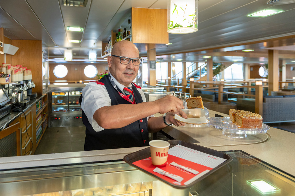 Fue un cliente habitual del mercado quién le sugirió que realizara los cursos requeridos para acceder a la plaza. Había hecho la promesa de que si conseguía el puesto de trabajo iría a agradecérselo a la Virgen del Pino en Teror. “Estaba necesitado en ese momento y fue una bendición”, relata. Agradece a la naviera la oportunidad que le brindó y lo bien que le han tratado desde entonces, consciente de que ha sido algo recíproco: “Yo también he respondido. Esto tienes que llevarlo en la sangre. Para mí es trabajo y relax, porque el mar me relaja. Además, atender al público es lo que he mamado desde chiquito. A nosotros nos dan un mes de vacaciones y cuando ya llevo veinte días quiero volver a embarcarme. Lo echo de menos, pero porque me gusta”.