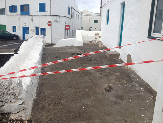 Efectivos del Consorcio de Seguridad y Emergencias procedieron a acordonar la zona para evitar que nadie pueda acercarse a la parte que ha sufrido desperfectos mientras técnicos del Ayuntamiento de Haría y del Cabildo de Lanzarote valoran los daños.
