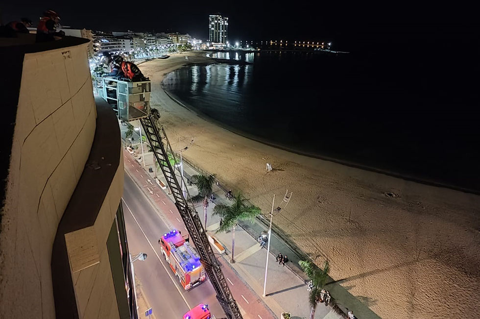 Los bomberos del Consorcio de Seguridad y Emergencias de Lanzarote tuvieron que intervenir en la tarde del jueves por la caída de cascotes en el edificio Siglo XXI, en frente de la playa del Reducto, en Arrecife.