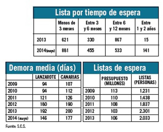 Desde el SCS aseguran que se está haciendo un esfuerzo y que se ha rebajado en el último año el número de pacientes que más tiempo llevan esperando. Ha disminuido la lista de espera de los que tardan entre seis meses y dos años en ser operados, pero a cambio ha aumentado el número de pacientes que esperan hasta seis meses. No obstante, la demora media es de 146 días en Lanzarote, por debajo de la media de Canarias, que se sitúa en 177 días. También ha aumentado un 13 por ciento el número de operaciones quirúrgicas que se han llevado a cabo en el Hospital José Molina Orosa: de 6.276 en 2012 a 7.118 el año pasado.
