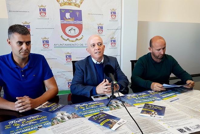 El alcalde de Tías, Pancho Hernández, acompañado por el teniente de alcalde y concejal de Cultura, Amado Jesús Vizcaíno, y el concejal de Fiestas y Deportes, Francisco Javier Aparicio Betancort, han presentado el cartel oficial de las fiestas y su programación, que incluyen 45 diferentes actividades, entre las cuales está la organización, por primera vez, la romería en honor a La Candelaria, a petición de los vecinos.