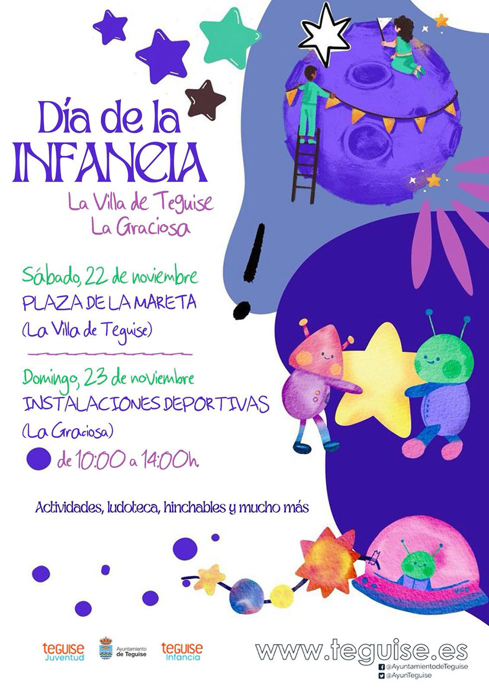 El Ayuntamiento de Teguise, a través de las áreas de Infancia y Juventud, han preparado una programación especial con motivo del Día Mundial de la Infancia, que se llevará a cabo el sábado 22 de noviembre en la plaza de La Mareta, en La Villa de Teguise, y el domingo 23 en las instalaciones deportivas de La Graciosa, ambas jornadas en horario de 10.00 a 14.00 horas. Con este programa, el Consistorio reafirma su compromiso con la promoción de espacios de convivencia y actividades que impulsen el desarrollo integral de los menores de todo el municipio.