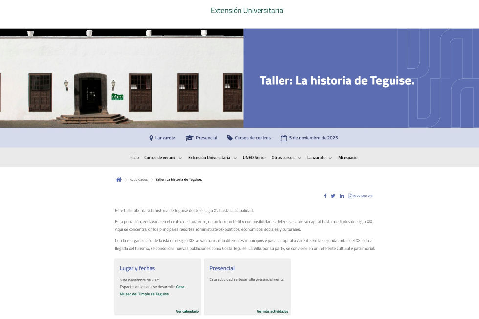 La Concejalía de Cultura del Ayuntamiento de Teguise, en colaboración con la UNED Lanzarote, organizan el Taller: La historia de Teguise. En el mismo se abordará su historia desde el siglo XV hasta la actualidad.