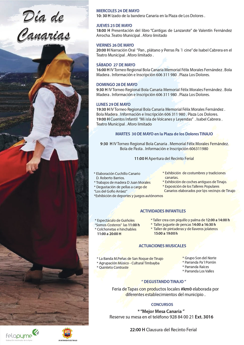 El Ayuntamiento de Tinajo llevará a cabo un itinerario completo de actividades para conmemorar el Día de Canarias. Desde el 24 al 30 de mayo se celebrarán multitud de eventos en el municipio para el disfrute de toda la familia. Los actos comenzarán con el izado de la bandera canaria en la Plaza de Los Dolores y finalizarán el 30 con las actuaciones musicales y actividades infantiles.