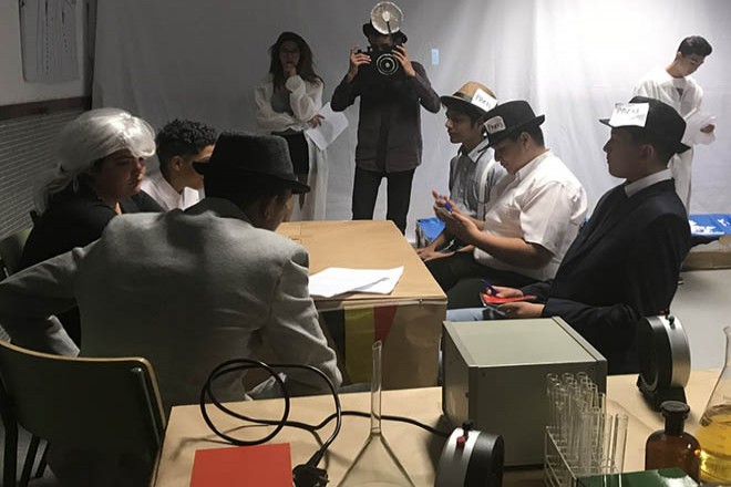 Ese día, en el Instituto han aparecido personajes célebres. Hay una rueda de prensa de Blas Cabrera con Marie Curie y Albert Einstein, mientras César Manrique pinta un cuadro ante la mirada de los visitantes. Se trata de “una mirada fresca al patrimonio” que tiene el objetivo de “crear ciudadanía en las aulas” y que, como resultado más inmediato, produce “que evolucionen mucho hablando en público, que tengan más seguridad y menos vergüenza”. “Lo que aprendes así no se te olvida, está demostrado que se aprende más con la emoción y en este proyecto ellos son los protagonistas”, asegura Esperanza Martínez.